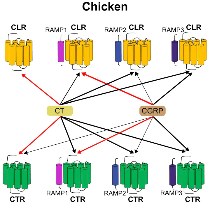 The calcitonin (CT) family of peptides, including CT and calcitonin gene-related peptide (CGRP), play crucial roles in calcium homeostasis and energy metabolism. In this study, we investigated the tissue expression profiles of these peptides and their receptors, calcitonin receptor (CTR), and calcitonin receptor-like receptor (CLR), along with their receptor activity-modifying proteins (RAMPs) in chickens. Our results showed that CT was highly expressed in the ultimobranchial gland, while CGRP was predominantly expressed in the proventriculus. CTR was highly expressed in the kidney, and CLR was highly expressed in the liver. RAMP1, RAMP2, and RAMP3 were also expressed in various tissues. Functional analysis revealed that chicken CTR is a high-affinity receptor for salmon CT (sCT) and chicken CT (cCT), while chicken CLR, when co-expressed with RAMP1, functions as a high-affinity receptor for chicken CGRP (cCGRP). Both receptors were coupled with the Gαs/cAMP signaling pathway. Furthermore, we found that cCGRP, but not sCT or cCT, could inhibit the expression of PEPCK and G6Pase, which are involved in gluconeogenesis in chicken primary hepatocytes. These findings suggest that the CT/CTR and CGRP/CLR/RAMP1 signaling pathways may have distinct physiological functions in chickens, and CGRP may play a role in regulating glucose metabolism in the liver.