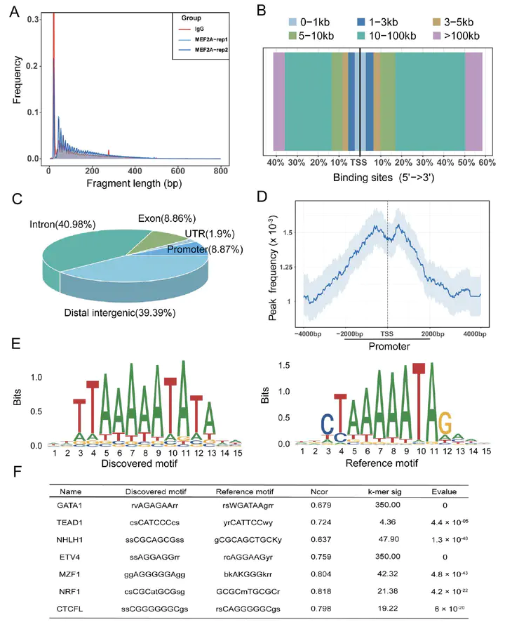 Myocyte enhancer factor 2A (MEF2A) is a key transcription factor that regulates myogenesis. However, the genome-wide binding sites of MEF2A in chickens remain unclear. This study aimed to map the genome-wide binding sites of MEF2A in chicken primary myoblasts using CUT&Tag sequencing. In total, 2,865 peaks were identified in the MEF2A group compared with the IgG control group, and these peaks were mainly located in introns and intergenic regions. In total, 1,768 target genes were identified, including MYH1E, MYL2, MYOM1, TNNC2, and ACTN2. Gene Ontology (GO) and Kyoto Encyclopedia of Genes and Genomes (KEGG) pathway analyses revealed that these target genes were primarily involved in muscle contraction, muscle cell development, and the cGMP-PKG signaling pathway. A protein-protein interaction (PPI) network was constructed, and hub genes such as ACTA1, MYH1F, MYL2, and MYOM1 were identified. Furthermore, we found that MEF2A could bind to the promoter of MYL2 and activate its transcription. The results of this study contribute to a better understanding of the molecular mechanisms by which MEF2A regulates myogenesis in chickens and provide new insights for poultry breeding.